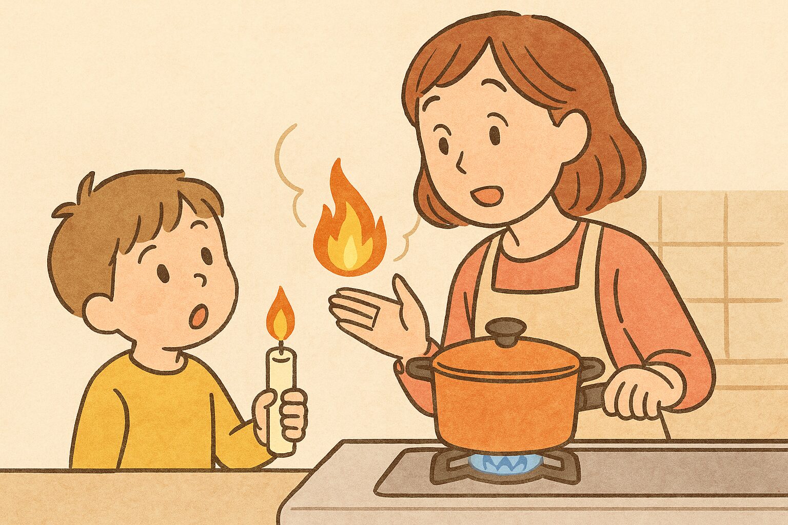 火は私たちの生活を支えてくれる大切な存在ですが、その便利さの裏には危険も潜んでいます。とはいえ、「火は危ないから近づかないでね」と言うだけでは子どもには伝わりにくいもの。私の家では、日常の中で“安全に使うためのルール”を少しずつ伝えるようにしています。火の仕組みと同じくらい、この安全の話が親子にとってとても重要だと感じています。